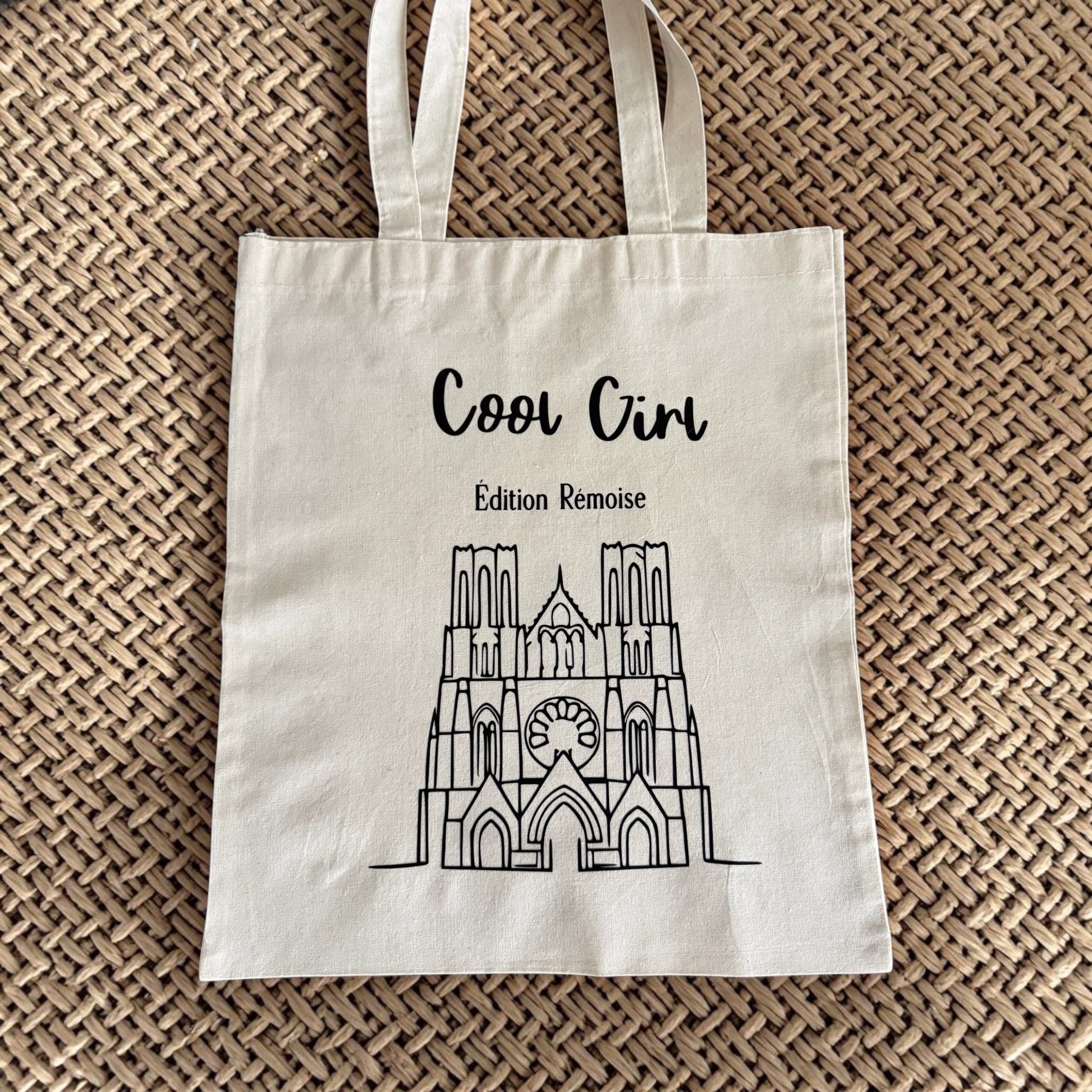 Avec son inscription “Cool Girl” et son illustration élégante de la cathédrale de Reims en line art, ce sac devient un véritable accessoire de style.